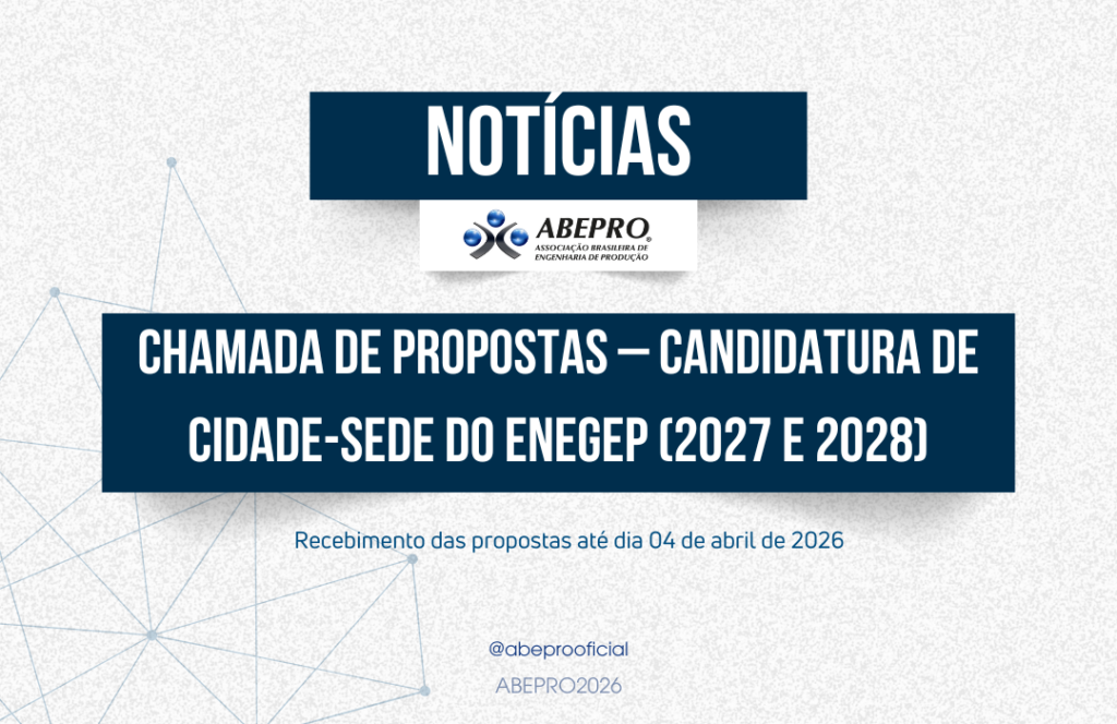 As candidaturas devem ser enviadas até 10 de abril de 2026 (nova data). As propostas devem ser encaminhadas em versão digital para: coordenacao@abepro.org.br Assunto: “Candidatura – Cidade X – ENEGEP – Edição” Principais dados a serem considerados, citados: O documento completo com todas as diretrizes: clique aqui Em caso de dúvidas, nossa equipe está disponível pelo e-mail:coordenacao@abepro.org.br […]