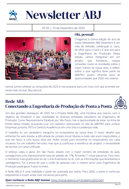 Esta edição marca o encerramento de mais um ciclo de atividades, destacando iniciativas que fortaleceram nossa rede estudantil, avanços relevantes na Engenharia de Produção e os principais acontecimentos que envolveram a comunidade ABJ ao longo do ano, proporcionando comunicação e engajamento.